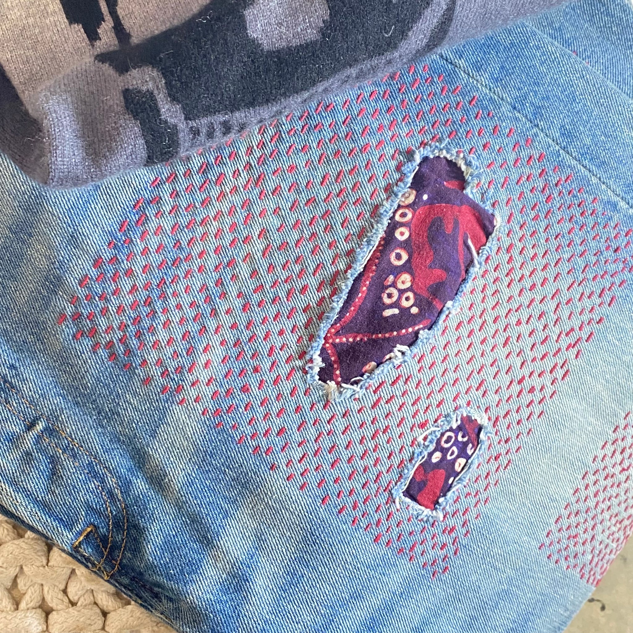 For our denim mends, cotton patching material sits under the hole/repair area to restore original strength and durability. The stitches literally weave the two fabrics together making something stronger than before...and of course, adding bit of swankiness to any pair of jeans.